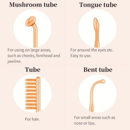 The high frequency facial wand has multiple functions such as skin care, massage, and hair quality improvement. The bend tube and tongue tube are suitable for small areas, the mushroom tube is suitable for large areas, and the comb tube is used for combing the hair and improving dryness. When in use, insert the tube into wand, then adjust to zero level, and then turn it on. Use it 2-3 times a week, 15-20 minutes each time, and use it in the same position for no more than 10 seconds.